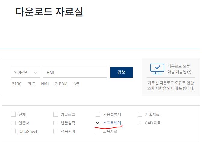다운로드 자료실에서 'HMI' 소프트웨어에 체크박스에 체크를 해주신 후 검색을 눌러주시면 됩니다.