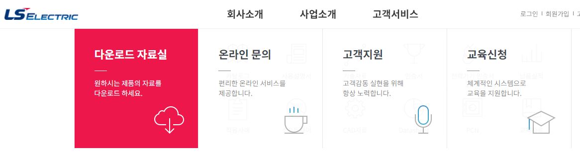 LS 산전 하단으로 스크롤 하면 나오는 화면 링크 들어가신 후 맨 하단으로 스크롤 하시면 다운로드 자료실이 나옵니다.