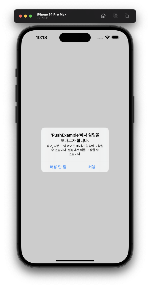 // registerForRemoteNotifications 에 대한 콜백 두 가지 // 장치에 대한 토큰을 가져오지 못한 경우 등록 실패 이류를 설명하는 오류와 함께 해당 메소드가 호출 func application(_ application: UIApplication, didFailToRegisterForRemoteNotificationsWithError error: Error) { print("원격 노티피케이션 사용불가 !! : \(error.localizedDescription)") } // 토큰을 받는데 성공한 경우, 이 장치에 알림을 전달할 수 있도록, 해당 토큰을 백엔드 푸시 서버로 보내야함 func application(_ application: UIApplication, didRegisterForRemoteNotificationsWithDeviceToken deviceToken: Data) { forwardTokenToServer(token: deviceToken) } func forwardTokenToServer(token: Data) { // 서버로 보내려면 문자열로 변환해야함 // 16진수 문자열로 변환한 다음 다시 결합하여 단일 문자열로 만들 수 있다. let deviceTokenString = token.map { data in String(format: "%02.2hhx", data) }.joined() print("deviceTokenString: \(deviceTokenString)") // 서버로 보내 데이터베이스에 등록 ! }등록, 콜백 처리까지 되었다면, 이제 우리는 유저에게 알림에 대한 권한을 요청을 해야겠죠 ?
