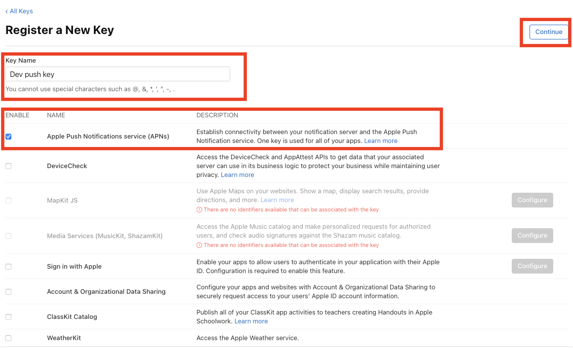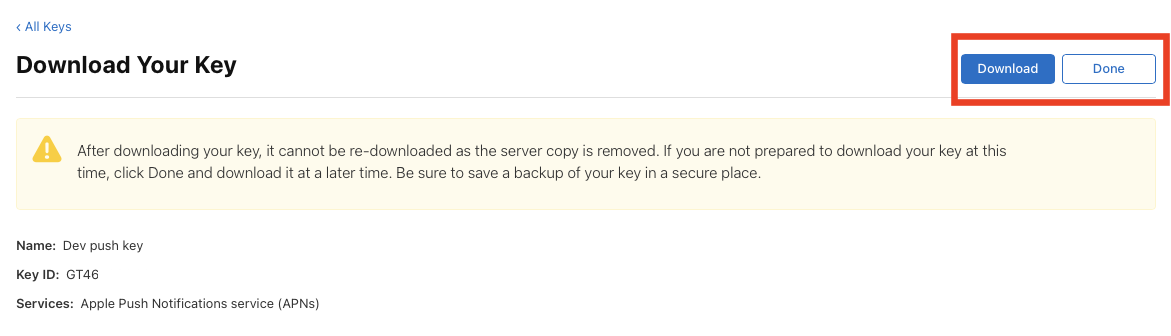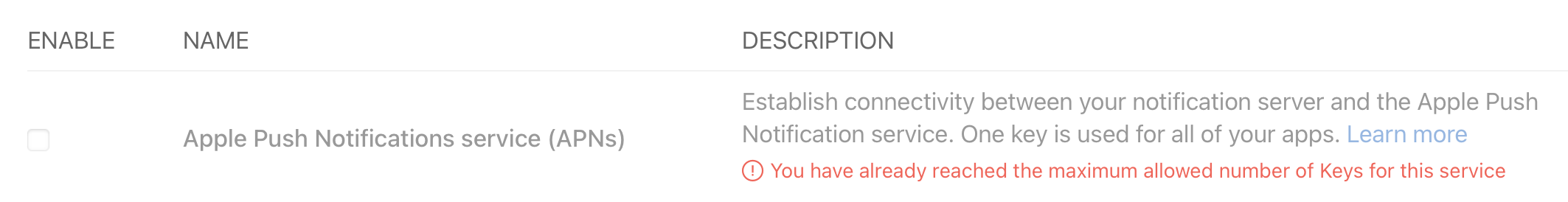 참고로, APNs 에 대한 Key는 최대 두개까지 생성가능합니다.