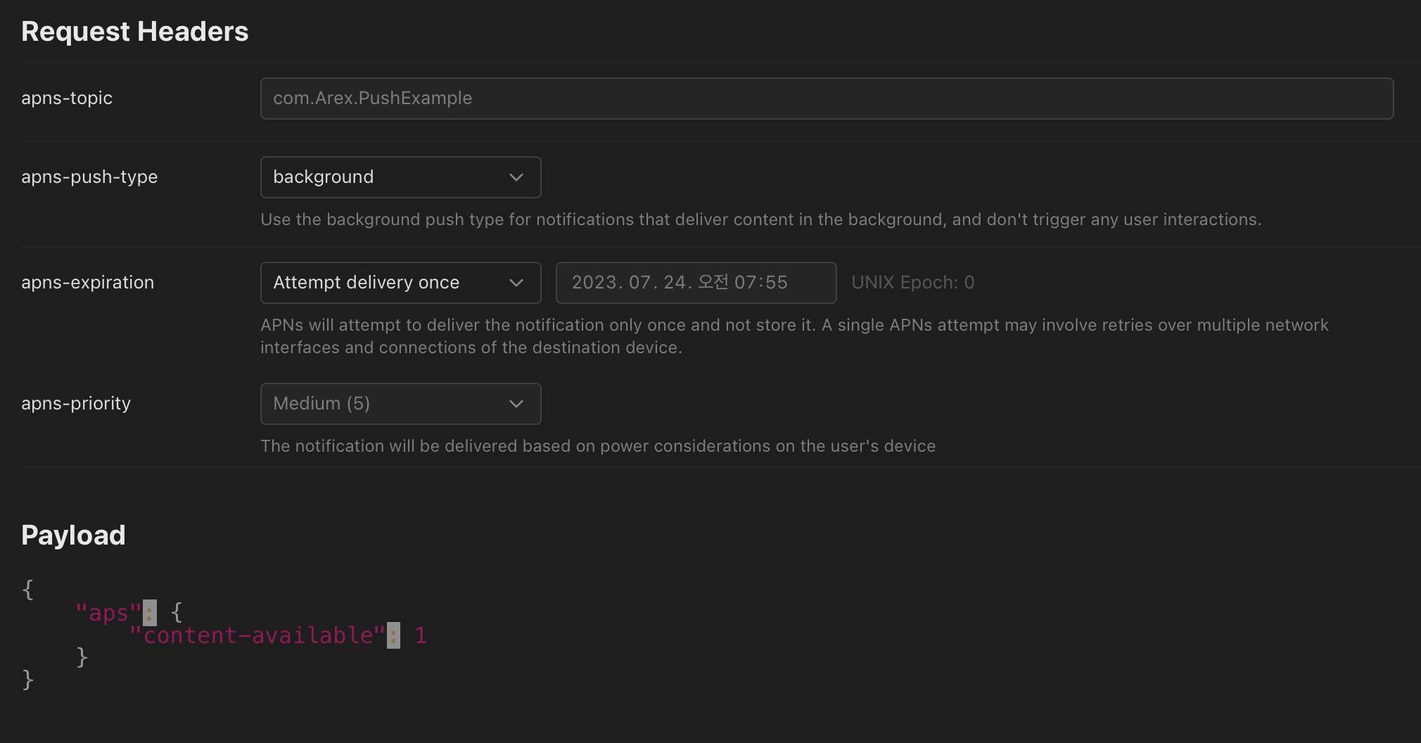게다가 apns-push-type 에 따라서 기본 Payload 또한 자동으로 변경이 되네요 !