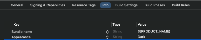 info.plist에 Appearance 와 Dark 를 쌍으로 추가해주세요