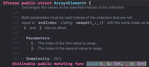 func solution(_ arr:[Int], _ queries:[[Int]]) -> [Int] { var swapTemp: Int = 0 var array = arr queries.forEach { swapTemp = array[$0[0]] array[$0[0]] = array[$0[1]] array[$0[1]] = swapTemp } return array }하지만 Swift에서는 swap 에 대한 메소드를 지원해줍니다.
