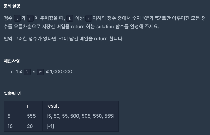func solution(_ l:Int, _ r:Int) -> [Int] { var result: [Int] = [] var count = 0 for i in (l...r) { count = 0 if i % 5 != 0 { continue } let charI = String(i) for c in charI { if !(c == "5" || c == "0") { count = 0; continue } count += 1 } if charI.count == count { result.append(i) } } return result.isEmpty ? [-1] : result }고차함수 이용