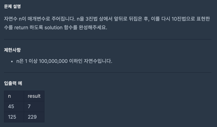 func solution(_ n: Int) -> Int { let ternary = String(n, radix: 3) let answer = Int(String(ternary.reversed()), radix: 3)! return answer }'기초라고 생각되는 것 > 문제풀이' 카테고리의 다른 글