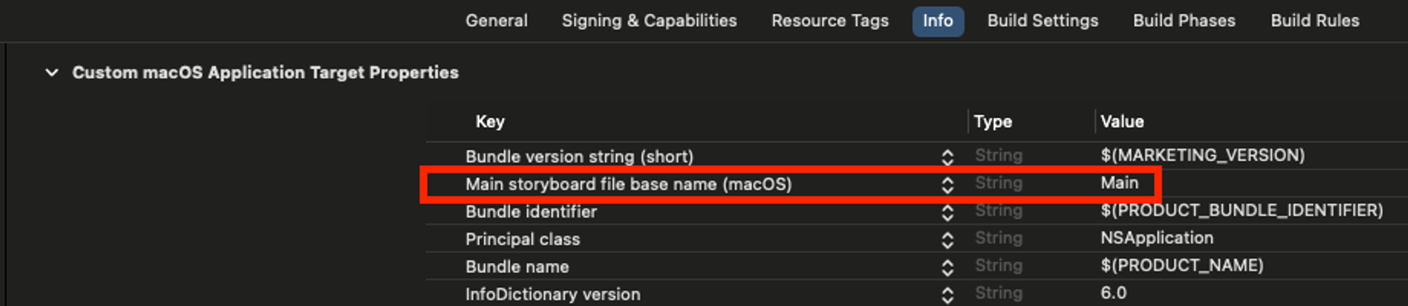 iOS와 마찬가지로 info.plist 파일에서 Main 참조하는 것을 지워줍시다.