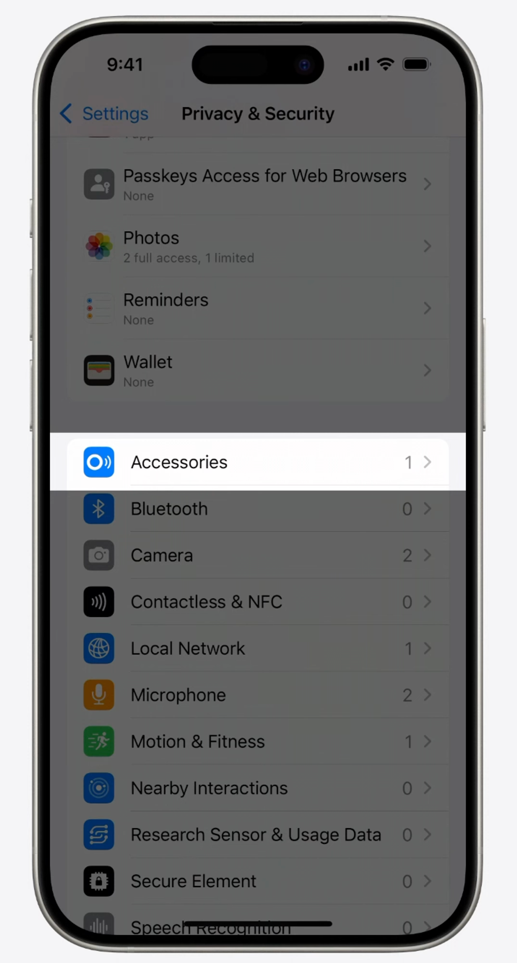 설정 앱 -> 프라이버시에 새롭게 액세서리가 생기고 관리할 수가 있습니다.