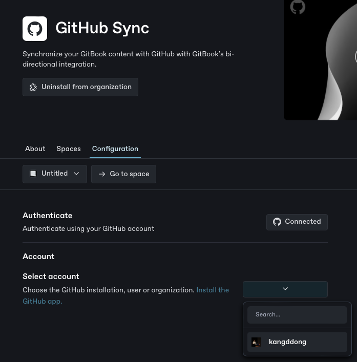 4. Intergrations 메뉴로 이동, Github Sync 설치 및 활성화를 시켜줍니다.