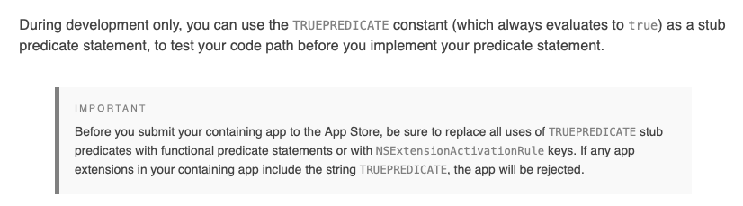 TRUEPREDICATE을 포함 하는 경우, 해당 앱은 심사 거부됩니다.