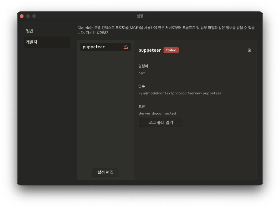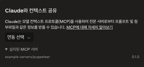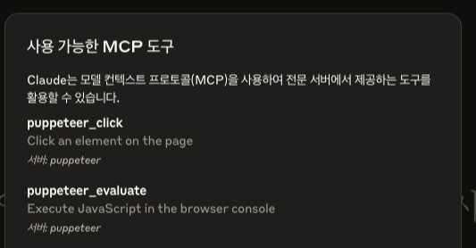 JSON 편집을 마쳤다면, 설정을 저장하고 Claude를 재시작하면 MCP 서버 목록에 Puppeteer가 활성화됩니다.