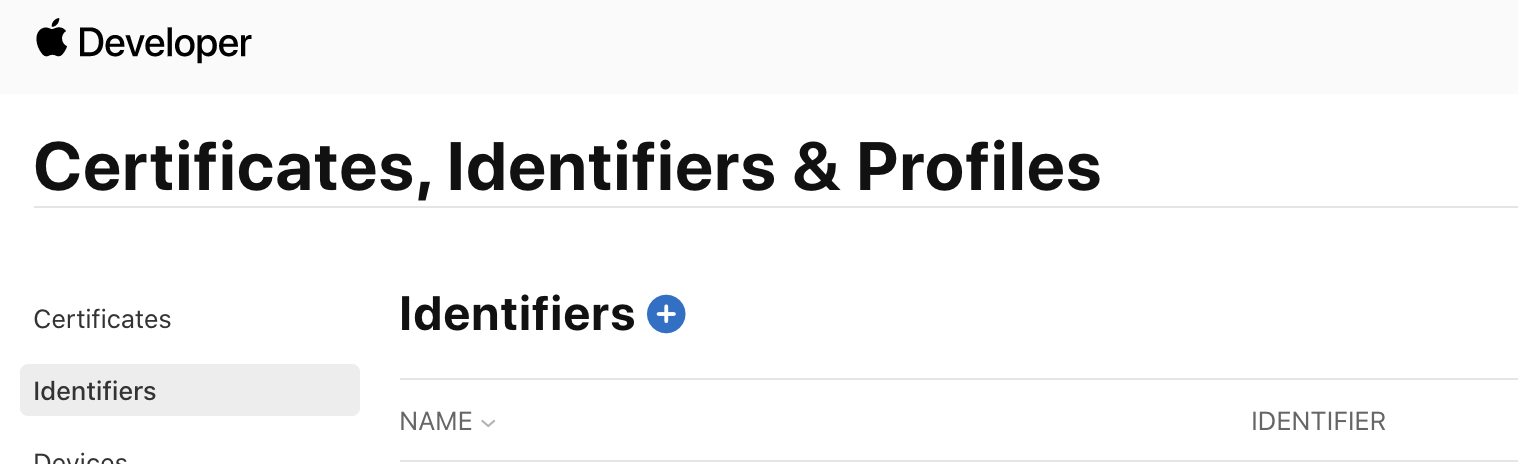 Apple 개발자 공홈에서 Certificates, Identifiers & Profiles에서 Identifiers를 선택합니다.