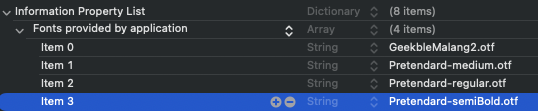 프로젝트에 글꼴 파일을 추가한 후에는 iOS에 해당 글꼴을 알려야 합니다. 이를 위해 Info.plist에 “Fonts provided by application” 키를 추가하십시오(원시 키 이름은 UIAppFonts입니다). Xcode는 키에 대한 배열 값을 생성합니다; 글꼴 파일 이름을 배열의 항목으로 추가합니다. 파일 확장자를 이름에 반드시 포함하십시오.