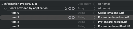 - 매우 간단하다. Xcode 프로젝트에 폰트를 위치시키고, info.plist 에 작성하여 프로젝트에 알리면 된다.