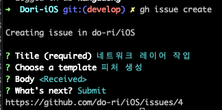 $ gh issue create만들어둔 Issue 템플릿이 있다면 선택하여 nano로 편집 가능하다