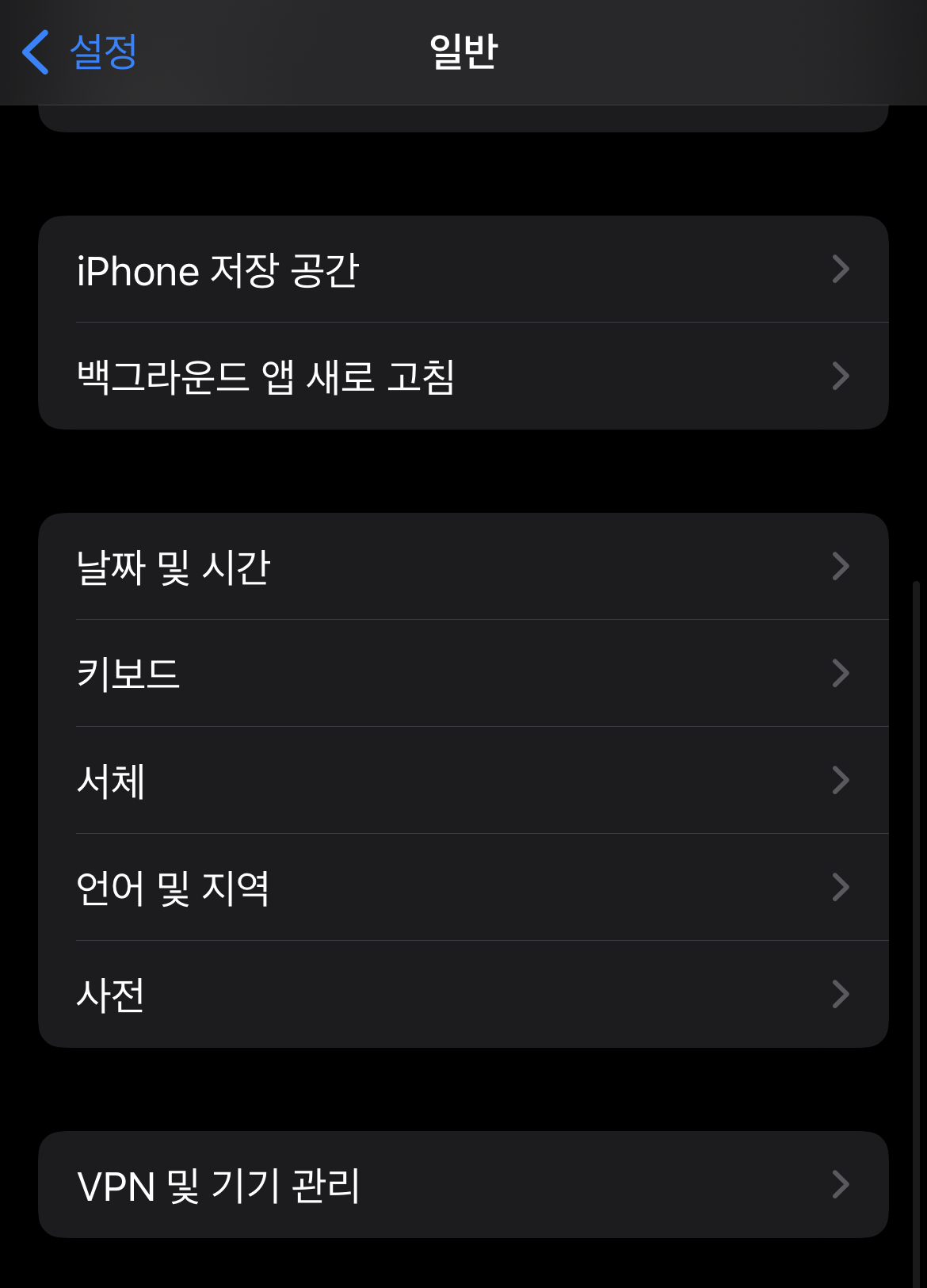 2. 스크롤을 내려서 하단에 VPN 및 기기 관리에 들어간다.