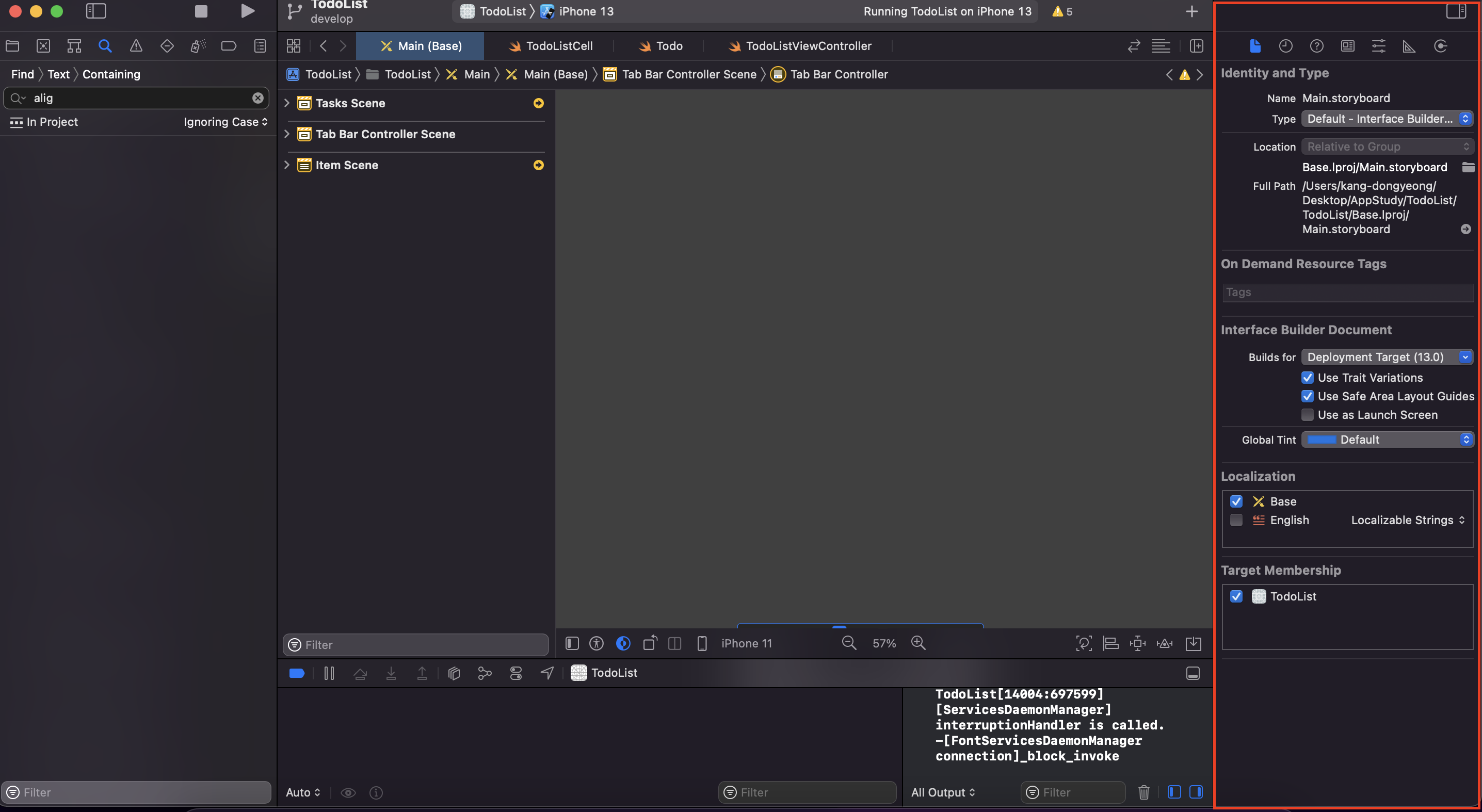- 아이덴티티 인스펙터 탭 (identity Inspector) - 스토리보드