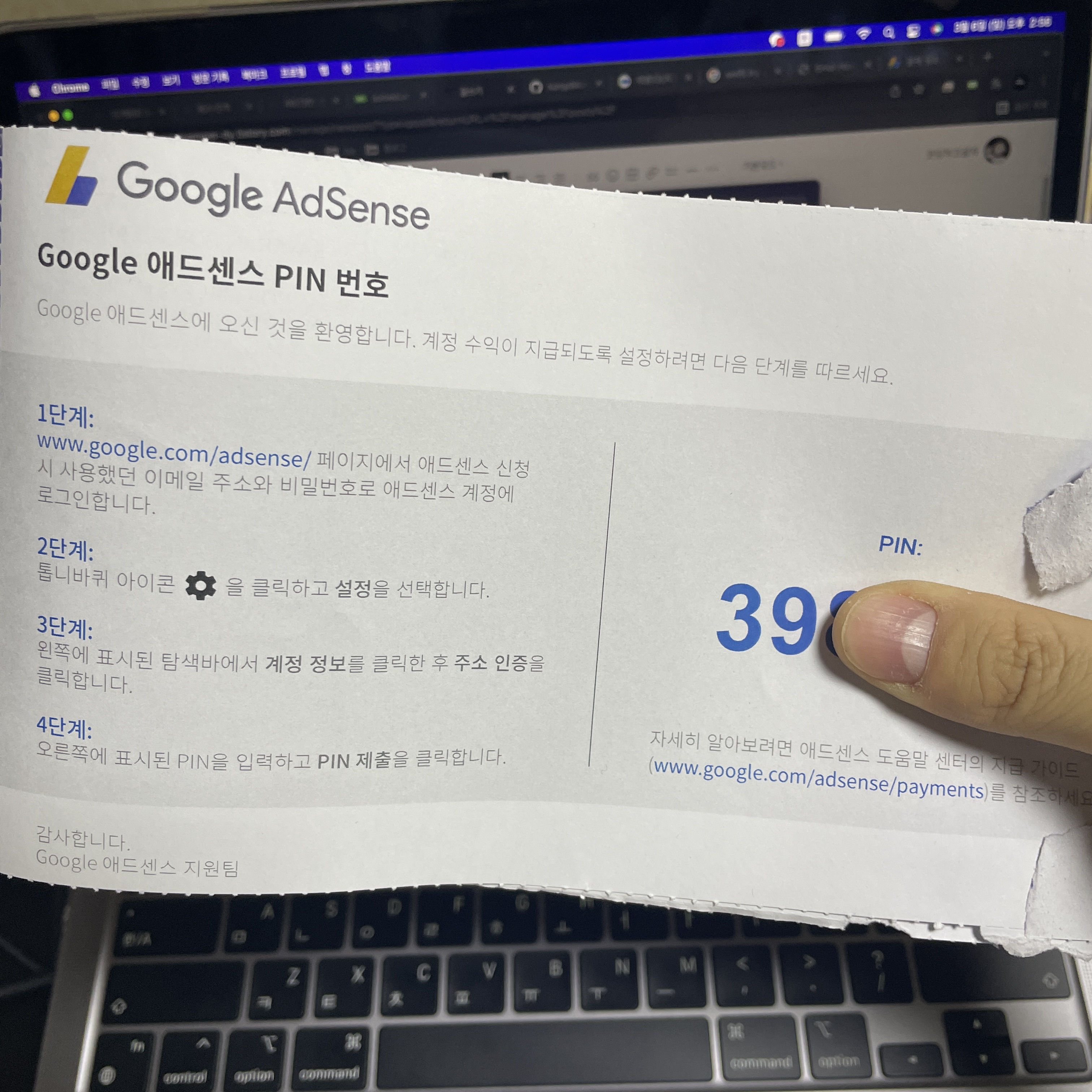 구글 애드센스의 주소지 입력 PIN번호 PIN코드를 보자마자 바로 등록을 해줬다.