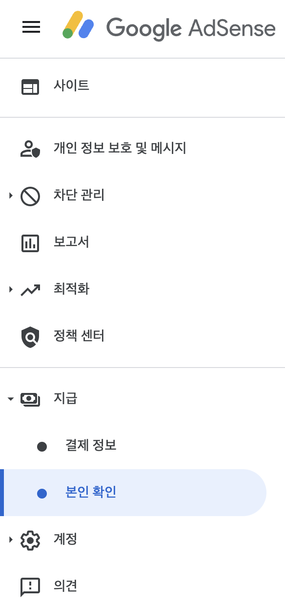 구글 애드센스 설정에 들어가 지급 - 본인확인으로 간다.
