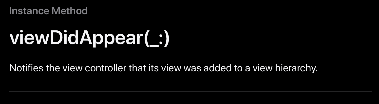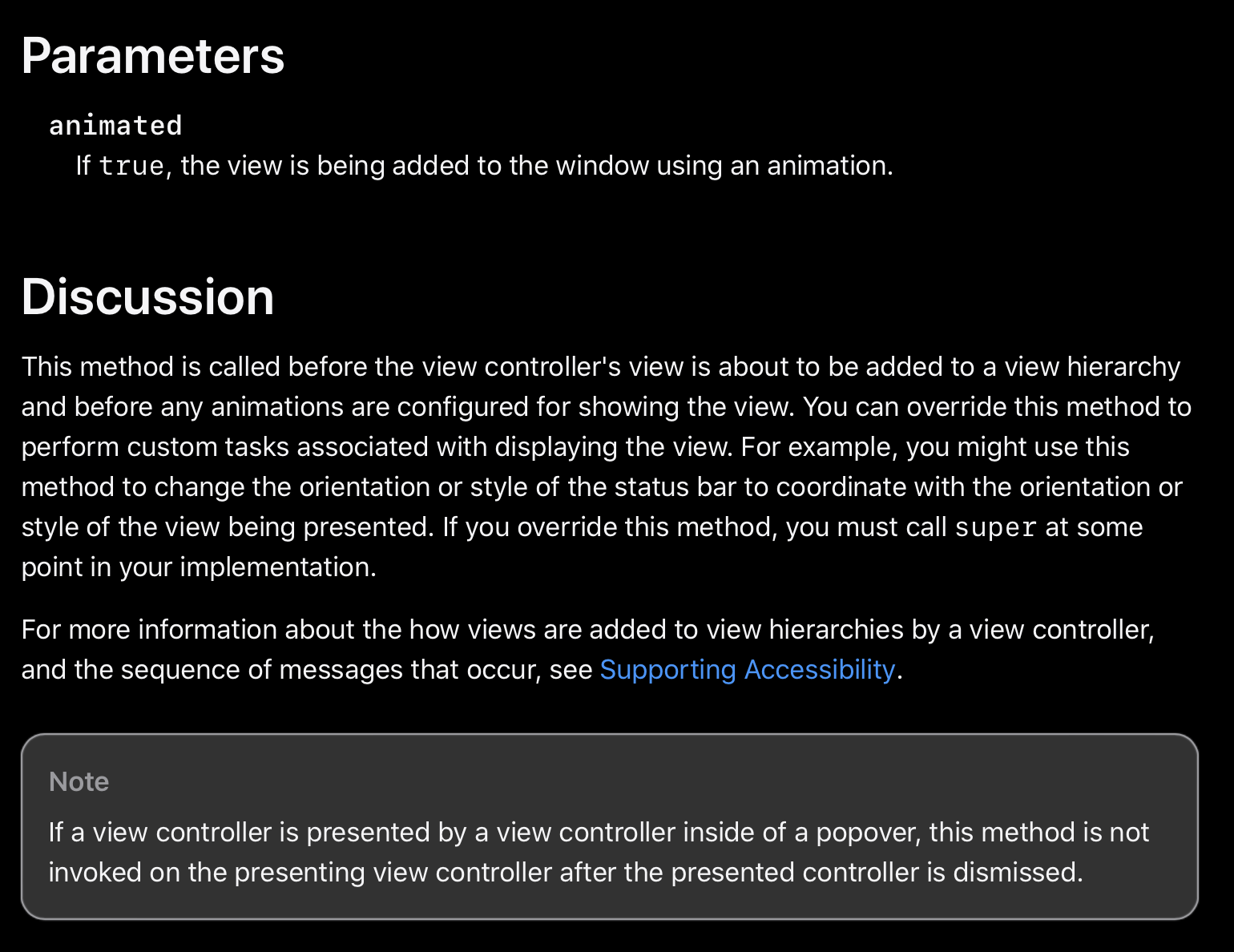 출처: Apple Developer view controller 의 view를 view 계층에 추가하기 전에 애니메이션을 구성하기 전에 호출된다고한다.