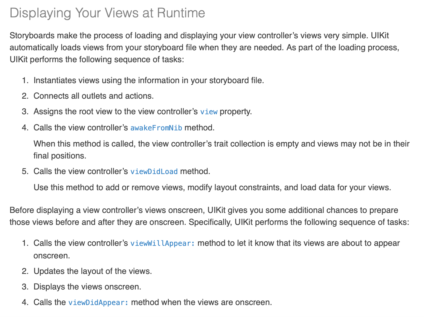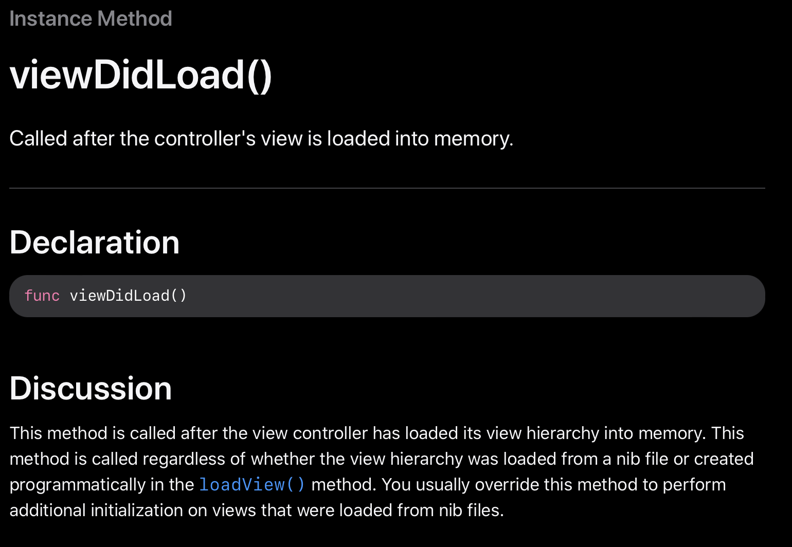 출처: Apple Developer 이 메소드는 view controller가 메모리에 불려졌을 때 호출이 되며 view가 nib 파일에서 호출되었는지, 프로그래밍적으로 loadView() 메소드에서 만들어졌는지 여부에 관계없이 호출되어진다고합니다.