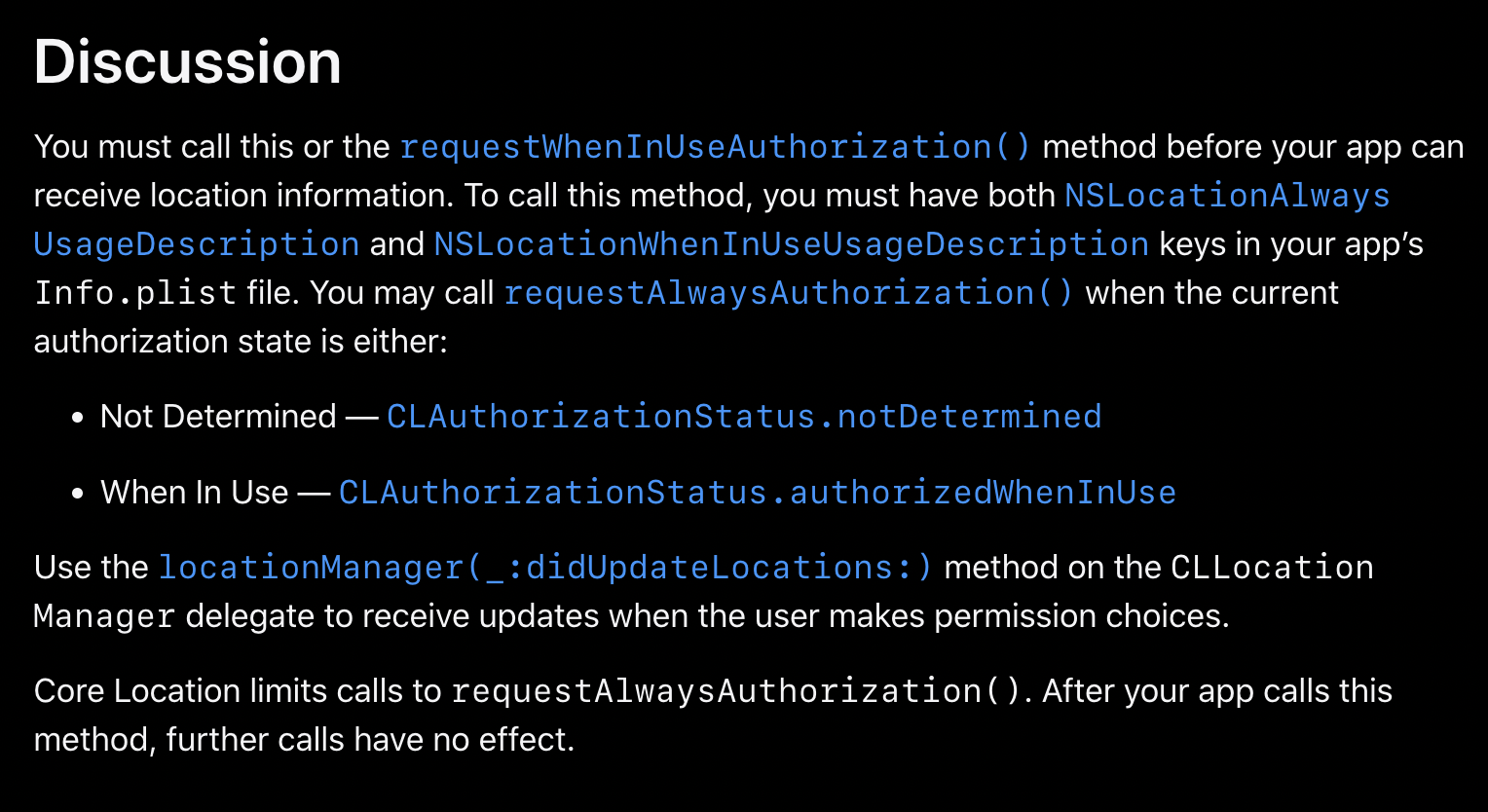 출처: Apple Developer 1. 위치 정보를 받기 전에 requestAlwaysAuthorization() 혹은 requestWhenInUseAuthorization() 메소드를 꼭 호출해야한다고합니다.
