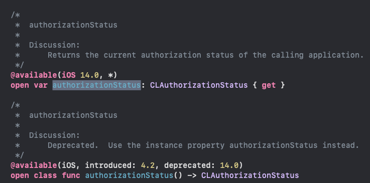 iOS 14.0 부터는 인스턴스 프로퍼티인 authorizationStatus 를 사용합니다.