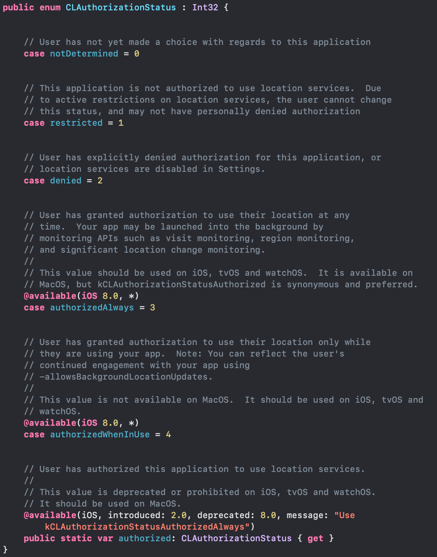 extension CLAuthorizationStatus: CustomStringConvertible { public var description: String { switch self { case .notDetermined: return "notDetermined" case .restricted: return "restricted" case .denied: return "denied" case .authorizedAlways: return "authorizedAlways" case .authorizedWhenInUse: return "authorizedWhenInUse" case .authorized: return "authorized" @unknown default: return "restricted" } } }반응형' > iOS 📱' 카테고리의 다른 글