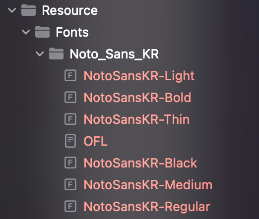 Fonts provided by application을 추가해주었다면, 우리가 방금 1번에서 추가한 파일들의 파일명과 확장자 전부 적어줘야한다.