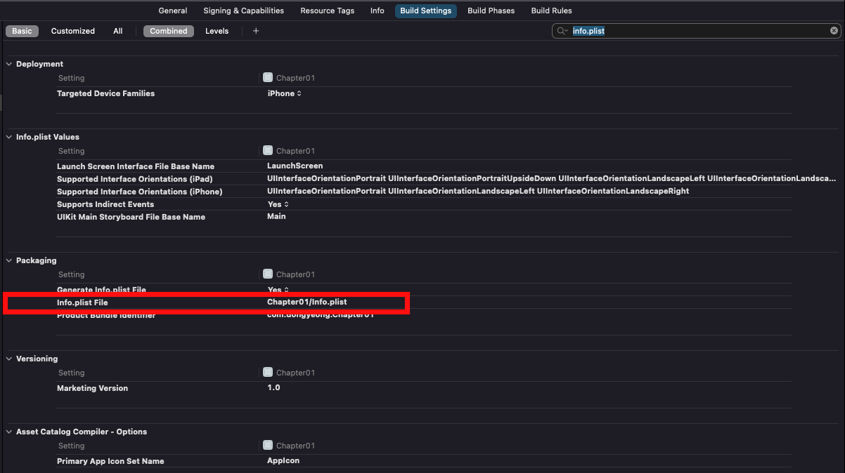 Chapter01/info.plist 가 보이네요 Chapter01/Supporting Files/info.plist 로 변경해보겠습니다 !
