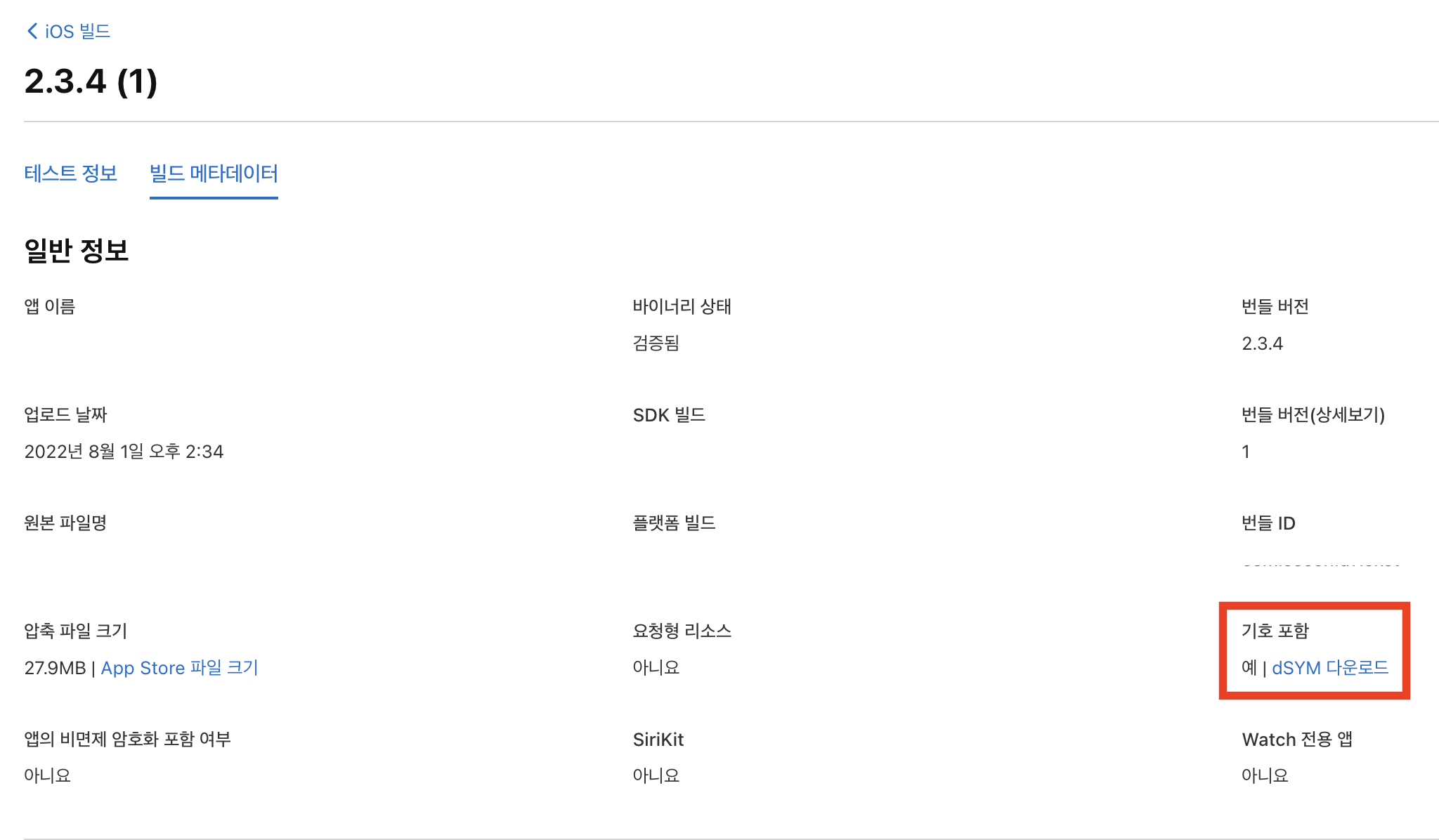 해당하는 빌드를 누르고 빌드 메타데이터 기호포함 필드에 dSYM 다운로드를 눌러주세요
