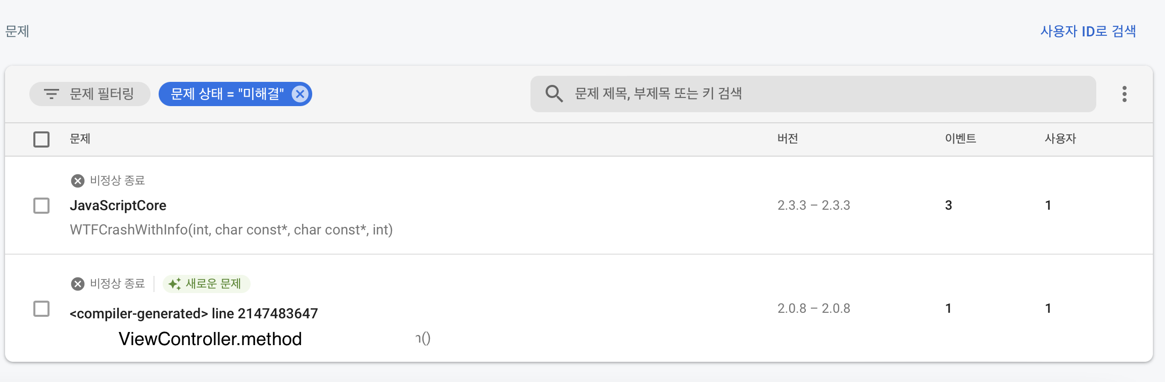 다시 Crashlytics 화면 상단으로 가보았습니다.