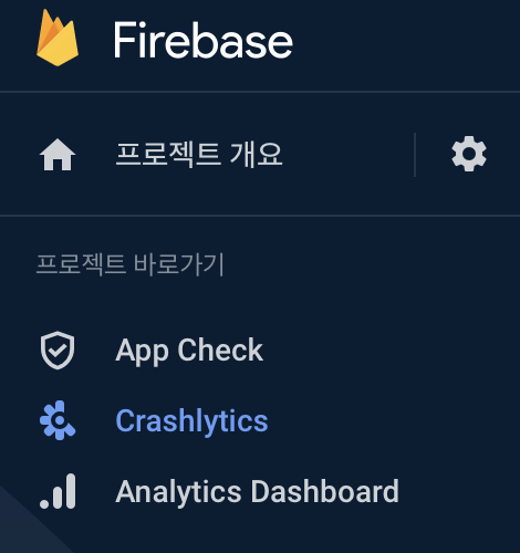 Firebase console로 이동 -> 해당하는 프로젝트 이동 -> 왼쪽 메뉴 바에서 Crashlytics 선택