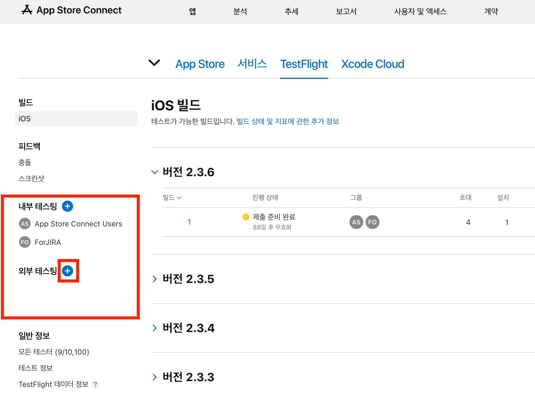 빨간 네모박스를 보시면 내부 테스팅과 외부테스팅이 있습니다.