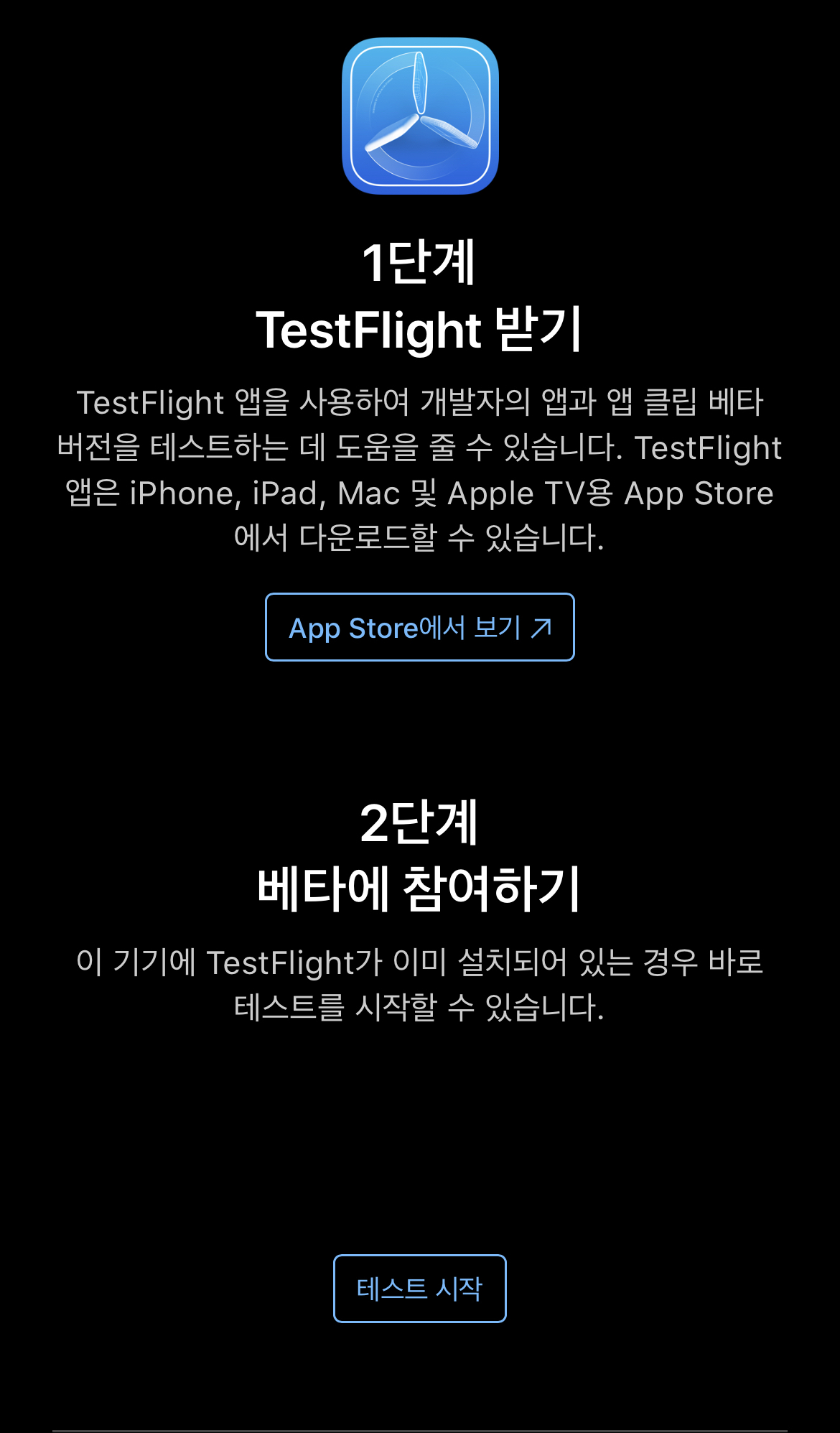 테스트 시작을 누르게 되면 전 이미 TestFlight가 설치되어 있어서 TestFlight로 이동하게 됩니다