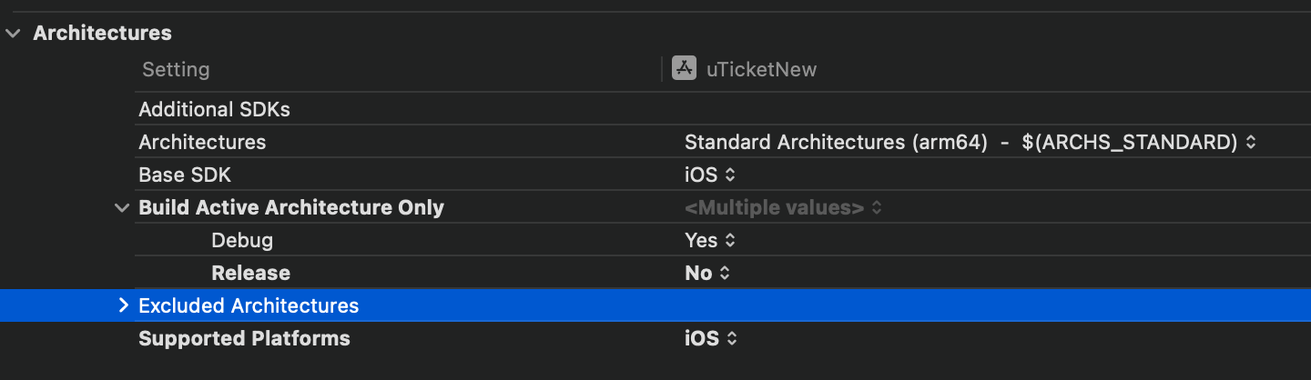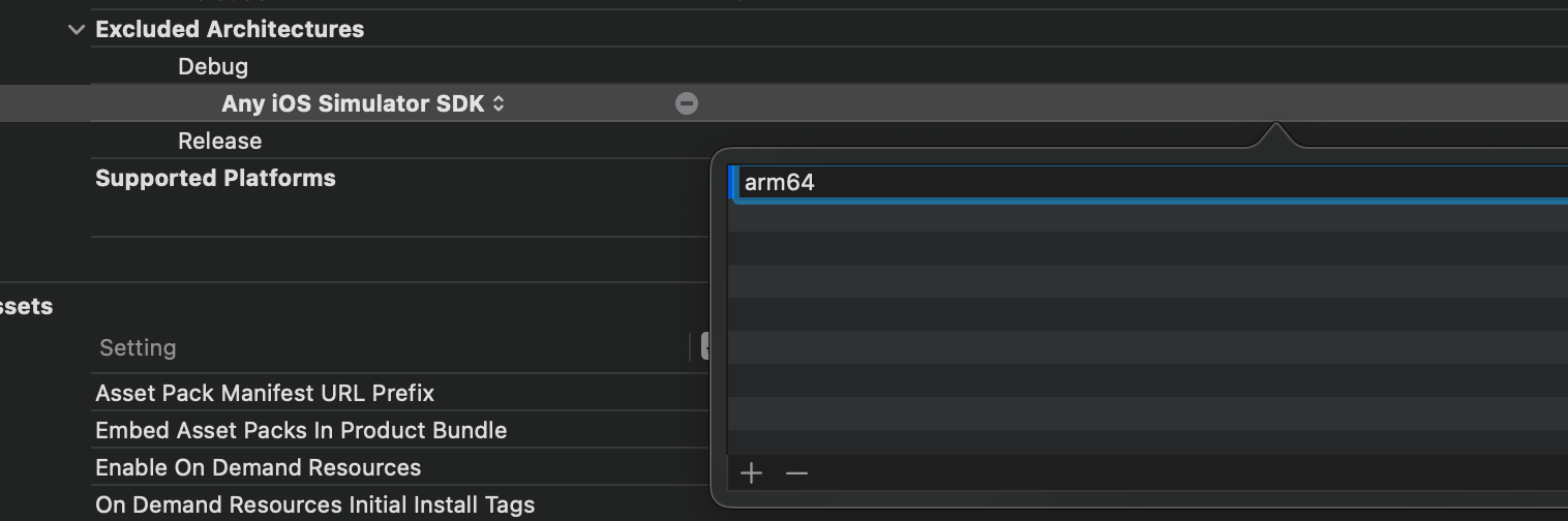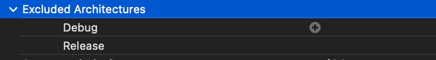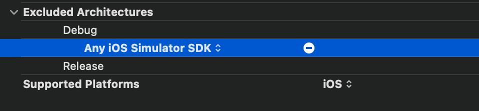 project -> TARGETS -> Build Settings -> Architectures -> Excluded Architectures + 버튼