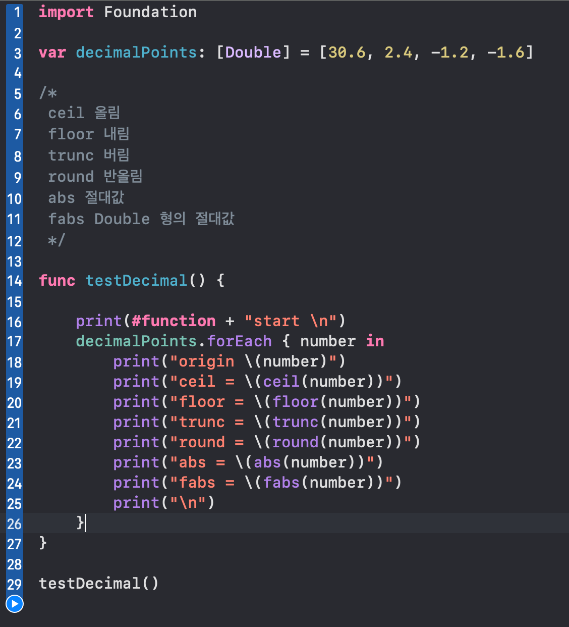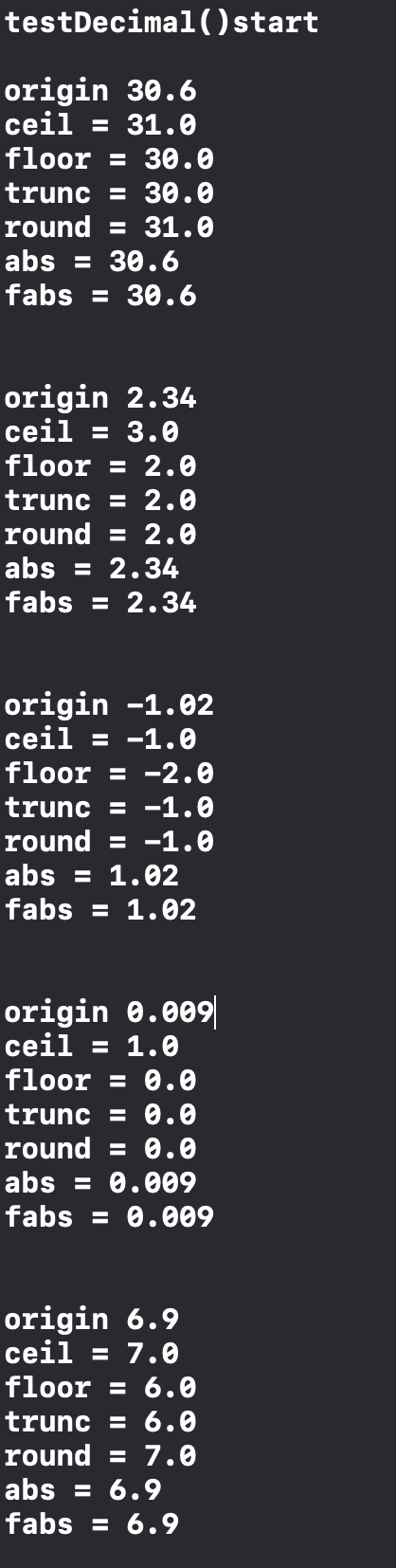 더보기import Foundation var decimalPoints: [Double] = [30.6, 2.4, -1.2, -1.6] /* ceil 올림 floor 내림 trunc 버림 round 반올림 abs 절대값 fabs Double 형의 절대값 */ func testDecimal() { print(#function + "start \n") decimalPoints.forEach { number in print("origin \(number)") print("ceil = \(ceil(number))") print("floor = \(floor(number))") print("trunc = \(trunc(number))") print("round = \(round(number))") print("abs = \(abs(number))") print("fabs = \(fabs(number))") print("\n") } } testDecimal()반응형' > Swift' 카테고리의 다른 글