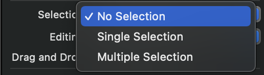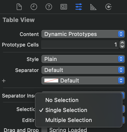 override func viewDidLoad() { super.viewDidLoad() // STEP 1: Single Selection tableView.allowsSelection = false }Single Selection