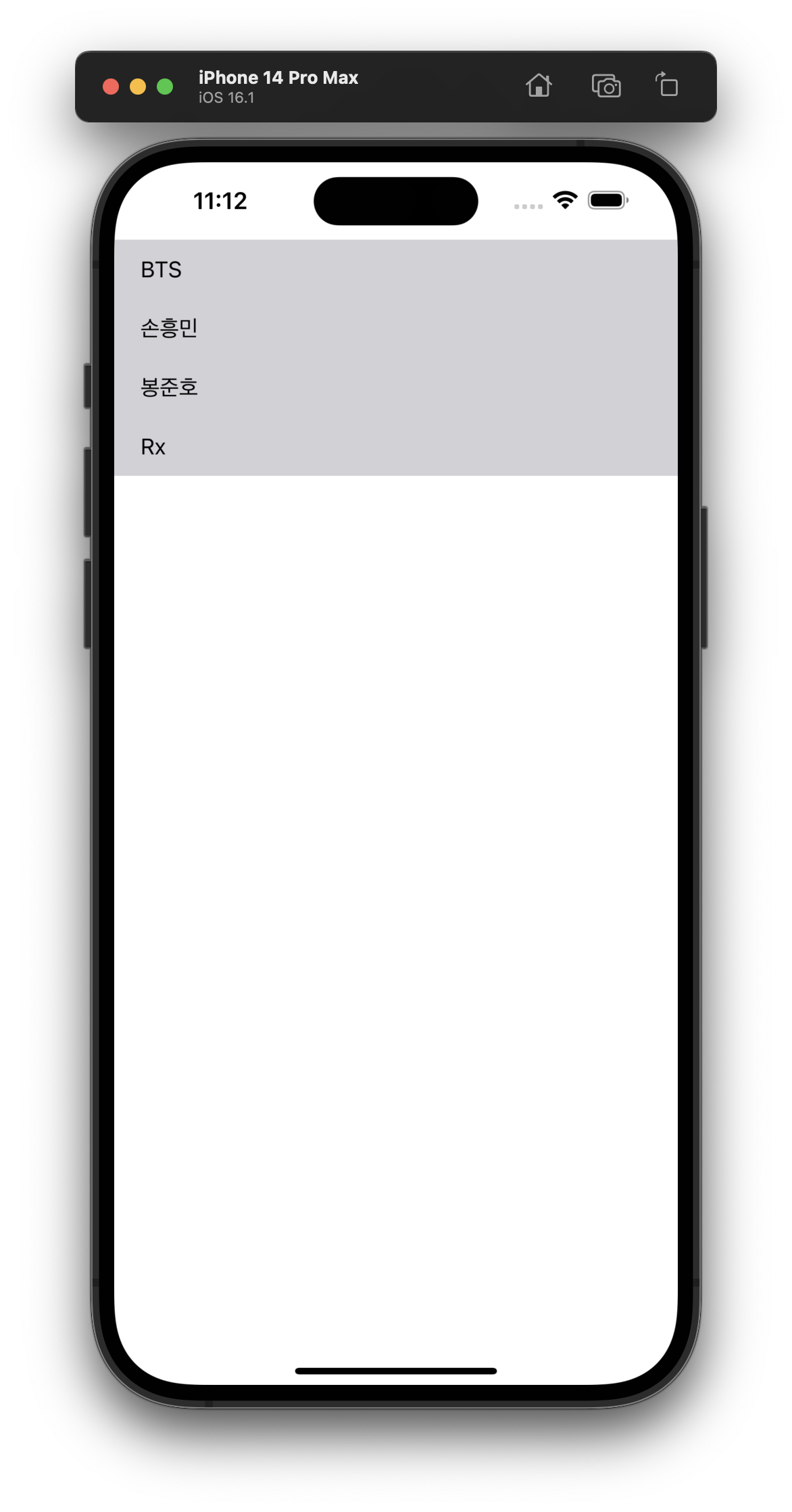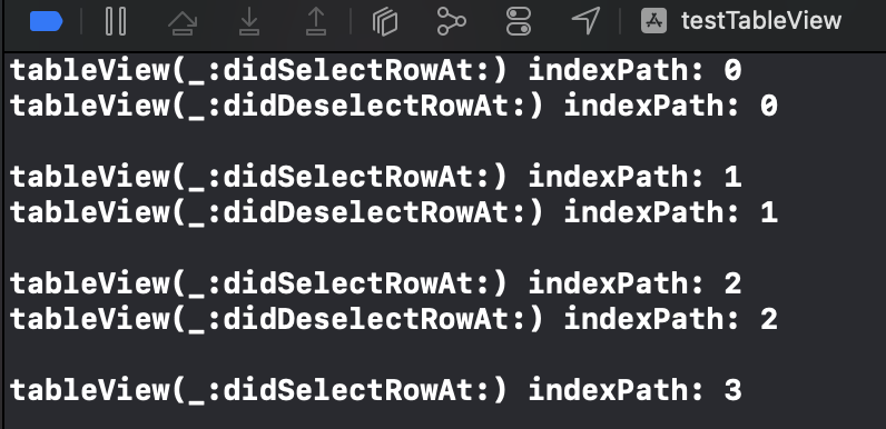 override func viewDidLoad() { super.viewDidLoad() // STEP 1: Single Selection tableView.allowsSelection = true } ... override func tableView(_ tableView: UITableView, didSelectRowAt indexPath: IndexPath) { print(#function, "indexPath: \(indexPath.row)") } override func tableView(_ tableView: UITableView, didDeselectRowAt indexPath: IndexPath) { print(#function, "indexPath: \(indexPath.row)\n") }구현 예제와 같이 BTS ~ Rx 순으로 셀의 선택을 바꿔보니, 아래와 같은 결과를 확인해볼 수 있습니다.