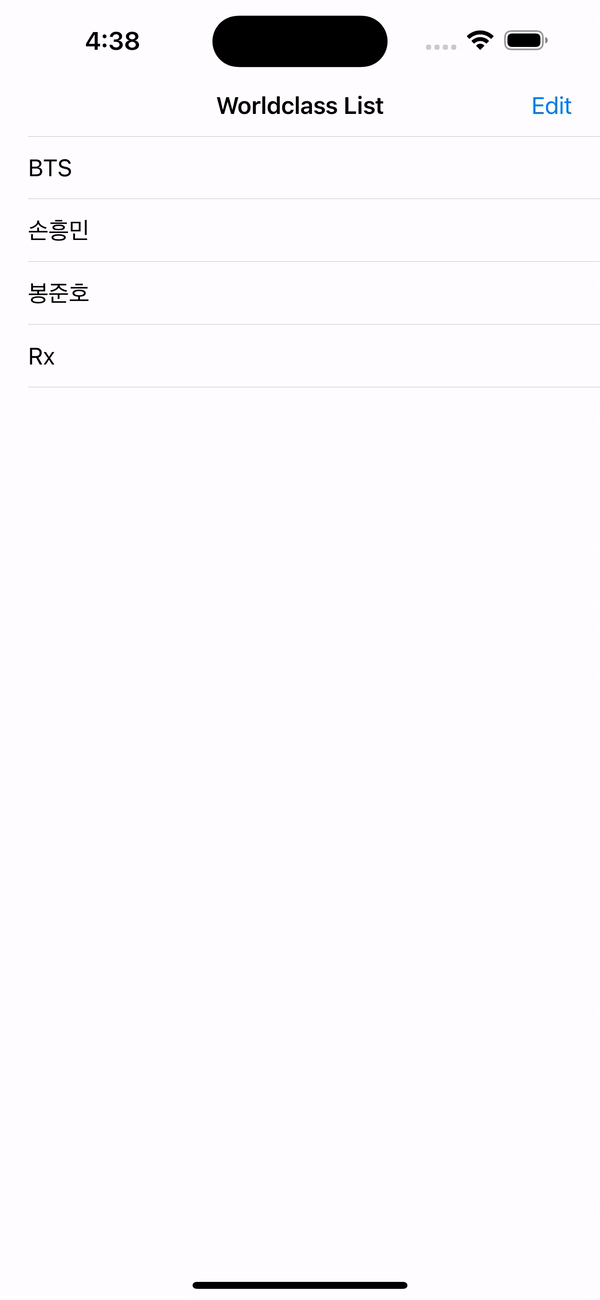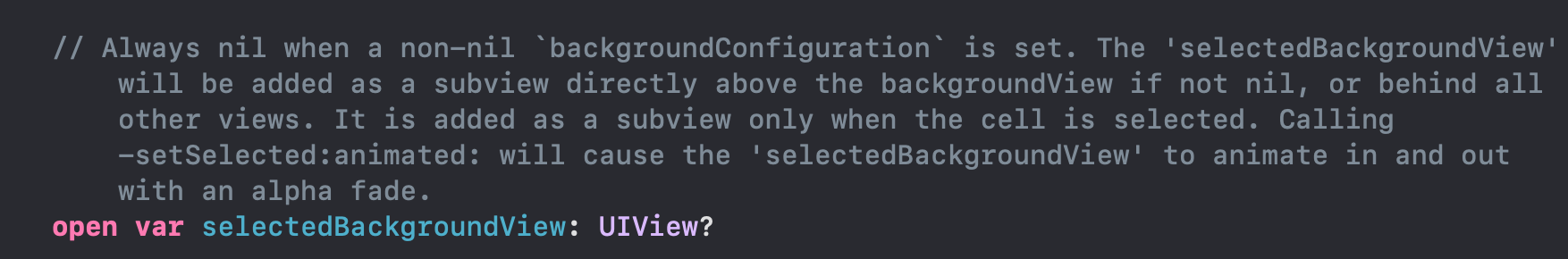 class TestTableViewController: UITableViewController { let worldClassList: [String] = ["BTS", "손흥민", "봉준호", "Rx"] let colorList: [UIColor] = [.systemPink, .lightGray, .cyan, .systemBrown] ... ... override func tableView(_ tableView: UITableView, cellForRowAt indexPath: IndexPath) -> UITableViewCell { let cell = tableView.dequeueReusableCell(withIdentifier: reuseIdentifier, for: indexPath) as! TestCell cell.textLabel?.text = worldClassList[indexPath.row] // STEP 3: Selection background Color & Animation let selectionBackgroundView = UIView() selectionBackgroundView.backgroundColor = colorList.randomElement() cell.selectedBackgroundView = selectionBackgroundView return cell }