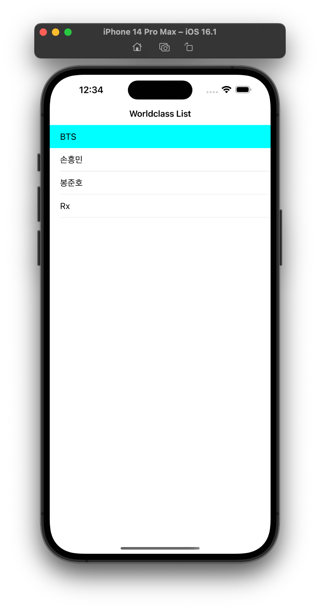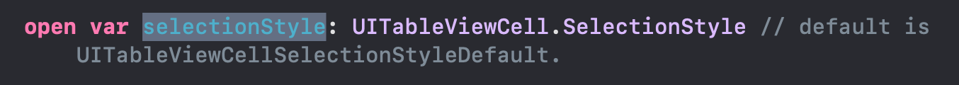 override func tableView(_ tableView: UITableView, cellForRowAt indexPath: IndexPath) -> UITableViewCell { let cell = tableView.dequeueReusableCell(withIdentifier: reuseIdentifier, for: indexPath) cell.textLabel?.text = worldClassList[indexPath.row] cell.selectionStyle = .none // none, blue, gray, default 4가지 return cell }4가지 속성이 있는데 자세히 알아보면 특이점이 있어요