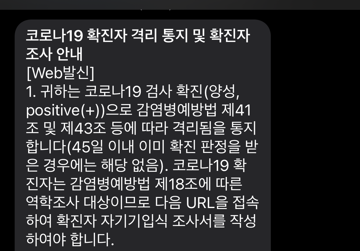 4월 7일(금)에 검진 및 확진을 받고, 4월 13일(목)까지 격리를 하고있어요.